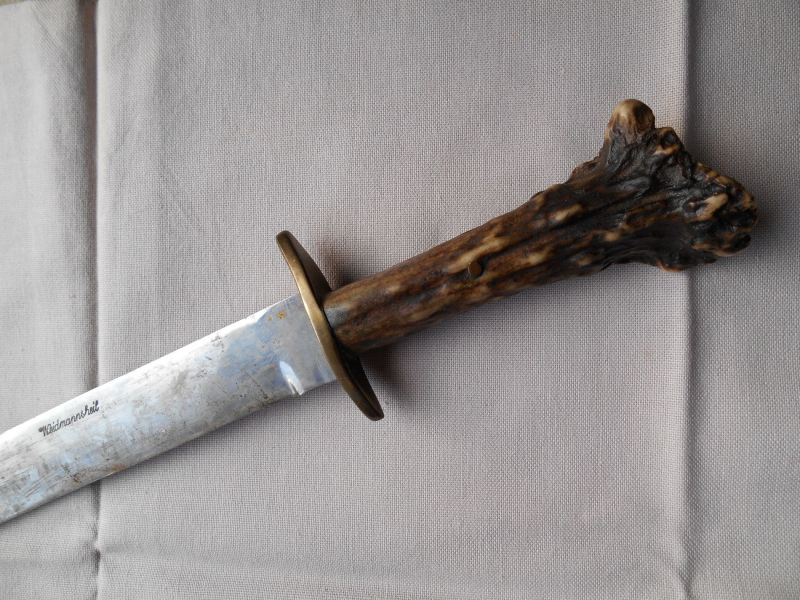 alter und schöner Hirschfänger, Hersteller WEIDMANNSHEIL, interessante Horn Schnitzerei in Griff eingelegt !!, Klinge ohne Fehlschärfe ca. 27,9 cm !!