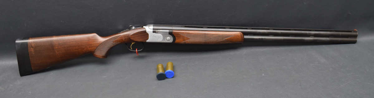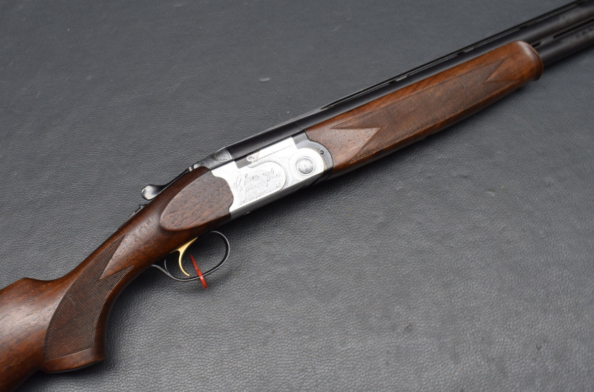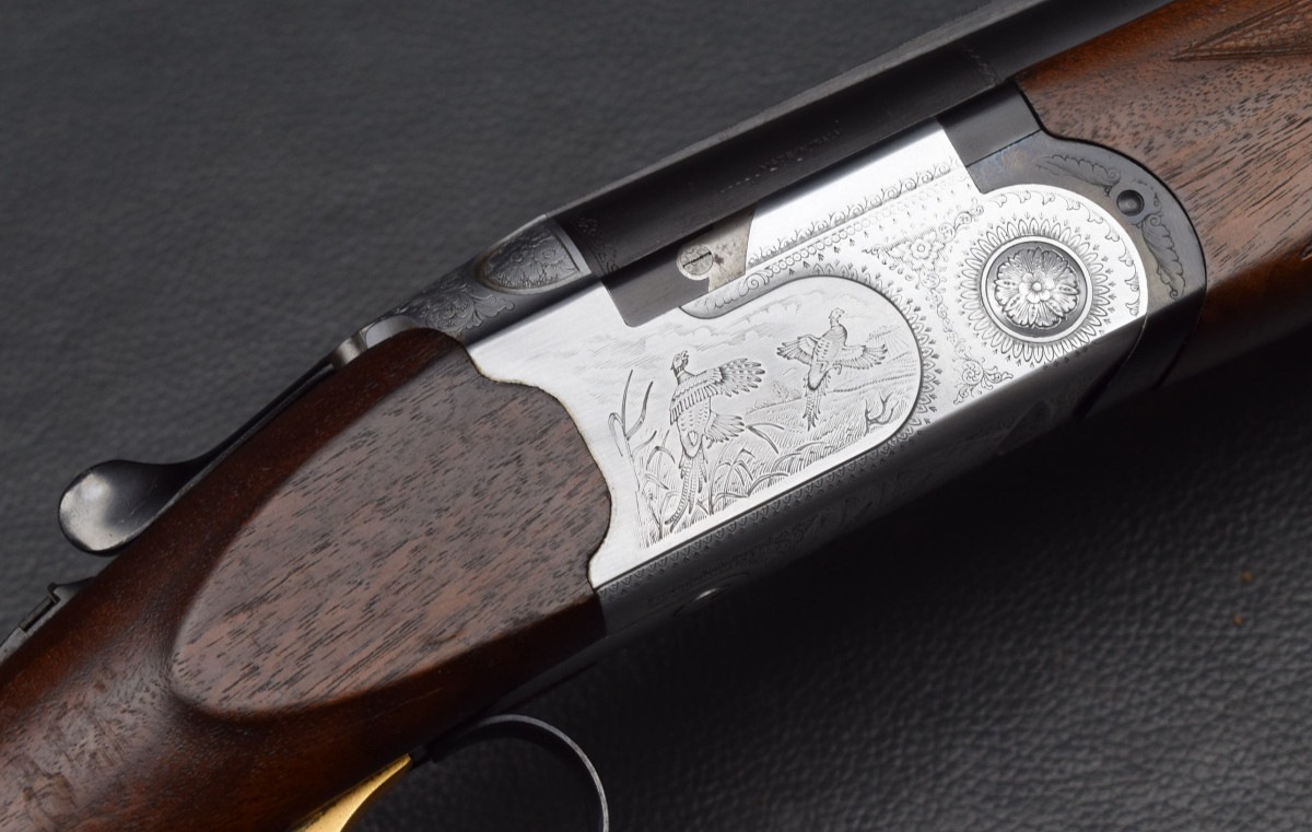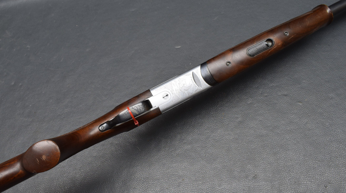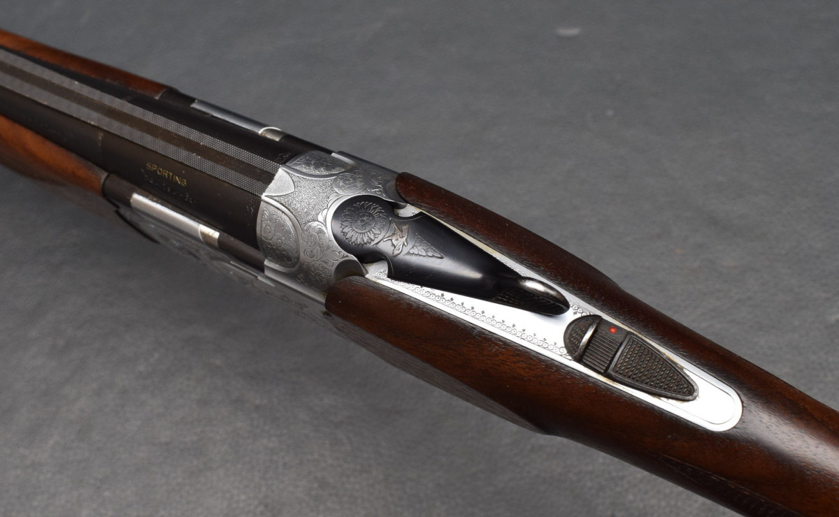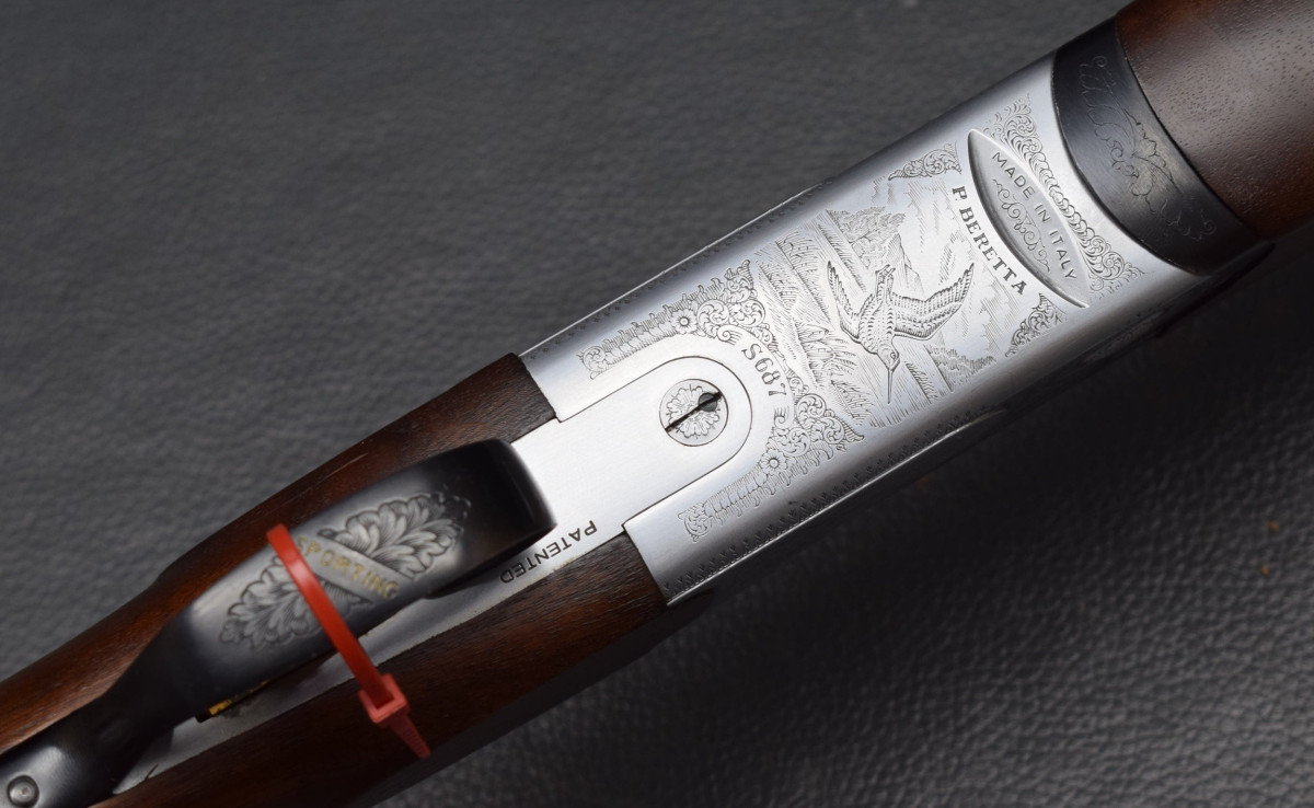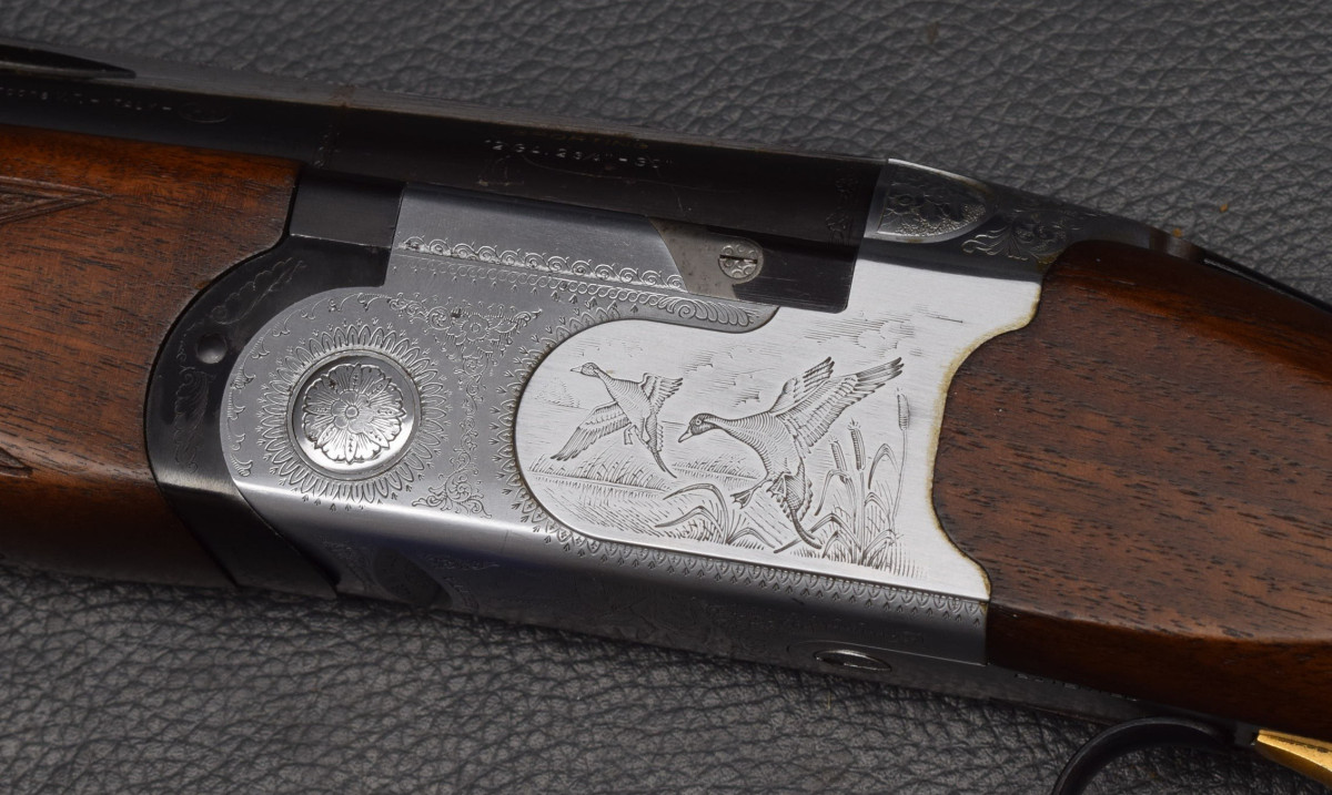 Stahlschrot-Beschuss! 12 mm breiter ventilierter Schiene, rotes Leuchtkorn, Ejektoren, Flankenverschluss, vergoldeter Einabzug, heller Stahlsytemkasten mit Flugwildgravur, Sicherungsschieber/Umschalter auf dem Kolbenhals,