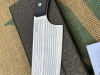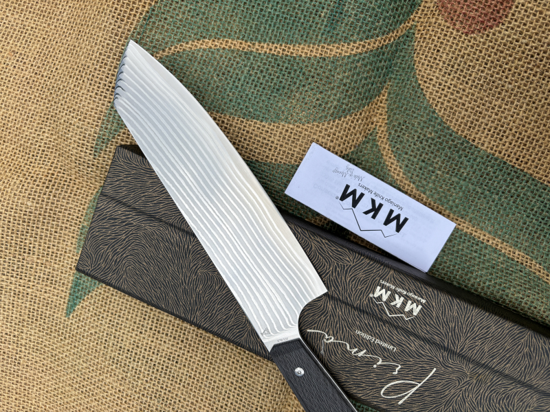 Der bekannte Messerdesigner Jens Anso greift zu Kochlöffel und Zeichenbrett und zaubert Gourmets mit der MKM Prima Serie ein vollmundiges Menü feinster Kochmesser auf den Tisch. Das Santoku ist ein typisch japanisches Küchenmesser für die Zubereitung von Gemüse, Fisch und Fleisch. Aufgrund seiner Klingenform und den vielfältigen Einsatzzwecken gilt das Santoku als das bekannteste japanische Kochmesser. In dieser besonderen Version ist das MKM Santoku mit einer edlen Takefu Damast-Klinge mit 65 Lagen bei einer Härte von 61-63 HRC ausgestattet. Typisch Anso gestaltet sich der Griff aus gold-schwarzem FAT-Carbon, der übliche Konventionen zu Gunsten moderner, kantiger Linien ausklammert.
