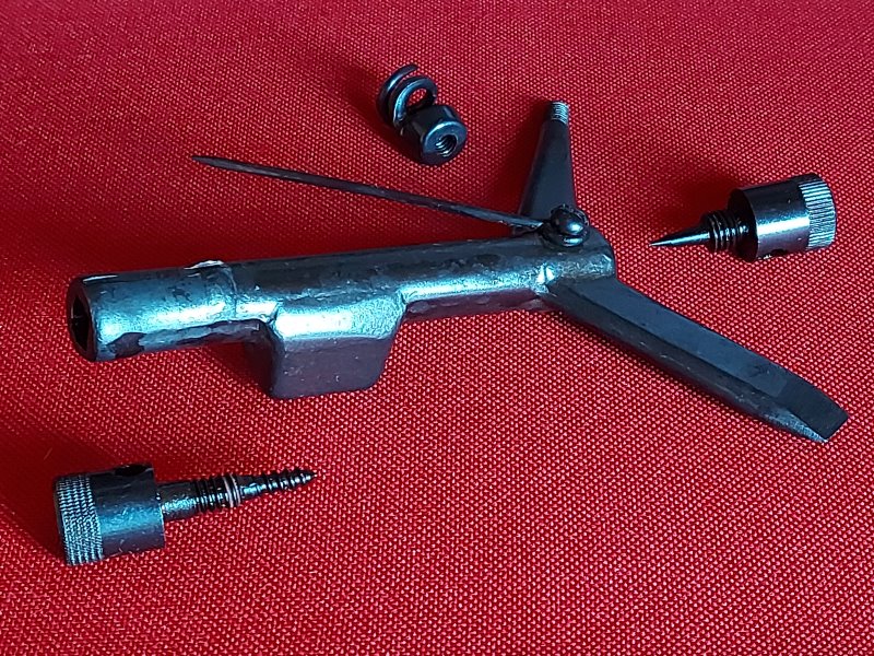 Meines Erachtens unbenutztes Kombiwerkzeug / SergeantsTool (Indien? Nachbau? Keine Ahnung!) mit ein- beziehungsweise aufzuschraubenden oder auszuklappenden Hilfsmitteln (Räumnadel, Kugelkratzer, Kugelzieher, Pistonschlüssel und anderes).
