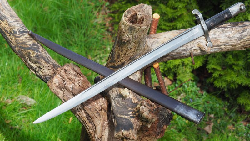 Das angebotene Bajonett ist in einem - für das Alter - hervoragendem Zustand. Die schöne 47cm lange Klinge in Yatagan-Form ist ohne Scharten oder Rost. Sie wurde nicht nachgeschärft oder sonstwie bearbeitet.  Die Scheide ist aus Stahlblech und hat zwei kleinere Dellen, die aber auf die Funktion keinen Einfluss haben. Die Griffschalen aus Nussholz sind nicht gebrochen oder gerissen.