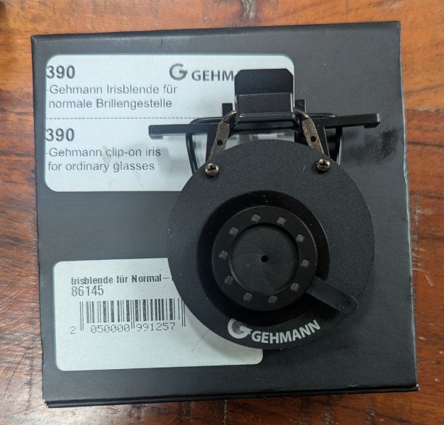Zum Verkauf steht eine maximal 5 mal verwendete Gehmann Irisblende zum Aufstecken auf ein normales Brillengestell samt der OVP. Neupreis ca 85€