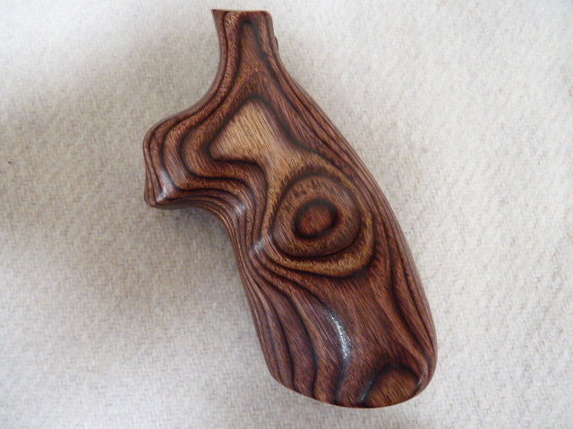 Griffschale für S&W-Revolver mit N-Rahmen, passend für Modell 629 in Round Butt-Ausführung, Combat-Style, Schichtholz, einteilig, halboffener Rücken, sehr guter Zustand.