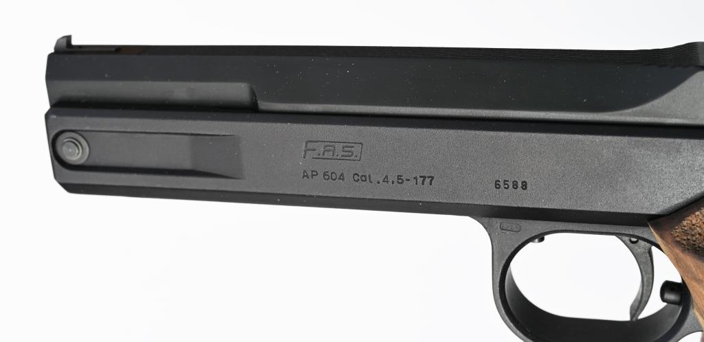 Kaliberangabe „Cal. 4,5/.177", Hersteller- und Modellbezeichnung "F.A.S. AP 604", Hinweis "Made in Italy", Artikelnummer"CAT. 3180", Seriennummer "51003", kleines Importeurzeichen "Akah".