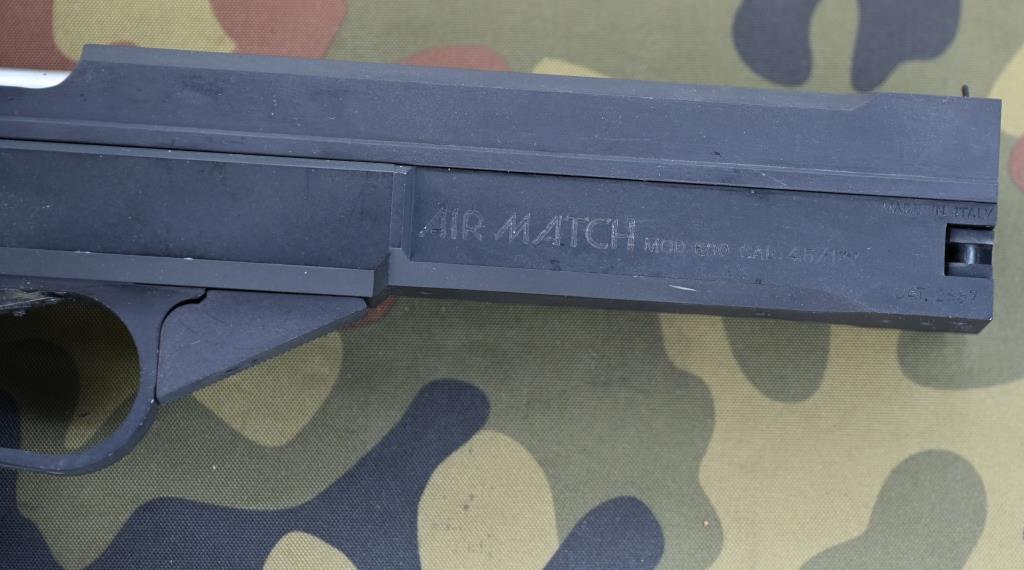 Kaliberangabe „Cal. 4,5/.177", Hersteller- und Modellbezeichnung "AIRMATCH Mod. 600", Hinweis "Made in Italy", Artikelnummer"CAT. 2887", Seriennummer "51003", "ALFA" auf dem Holzgriff.