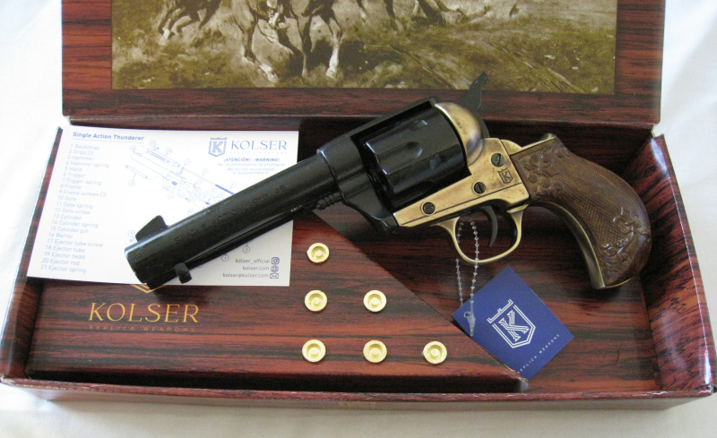 KOLSER DEKO / MODELL WAFFE COLT THUNDERER USA 1877 - NICHT SCHUSSFÄHIG - Metall Schwarz/Brass - Imitationgriff graviert - Vogelgriff - Alle Metallteilen beweglich - Länge 25,5cm Gewicht ca. 910gr - Geliefert im Geschenkkarton mit 6 Dekopatronen - Zündkapseln möglich -