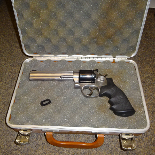 Wegen Hobbyaufgabe abzugeben: Gepflegter S&W 686-4 mit verstellbarer Visierung, Match-Hammer, Match-Abzug, Pachmayr-Griff und schwarzer Trommel. Vermutlich bezieht sich auf die letztgenannte Besonderheit die "Euro-Match - 1 of 500" Serie.