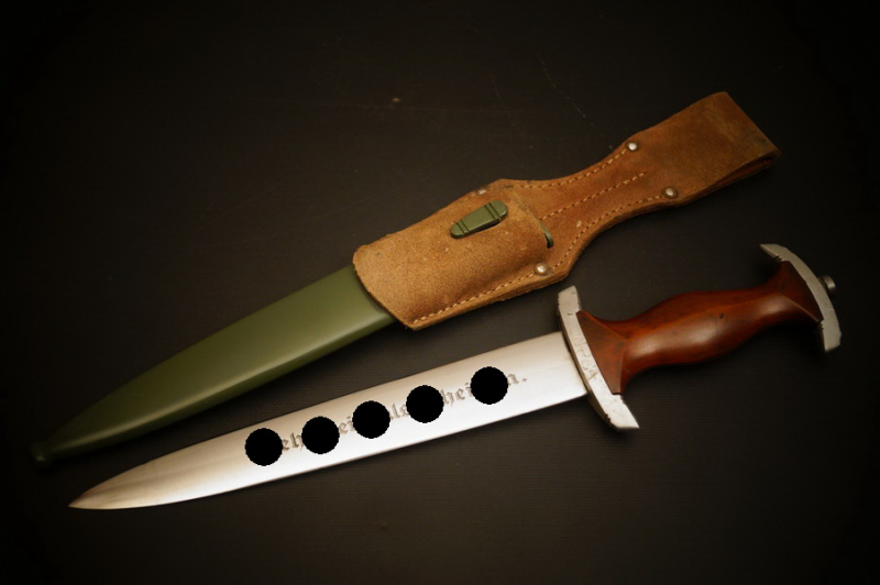 Fundzustand. Stahlscheide, saugender Sitz der geschmiedeten Klinge. Motto und Hersteller geätzt. Holzgriffschalen und paarige Parierstangen aus Alu. Kopfschraube aus Eisen.