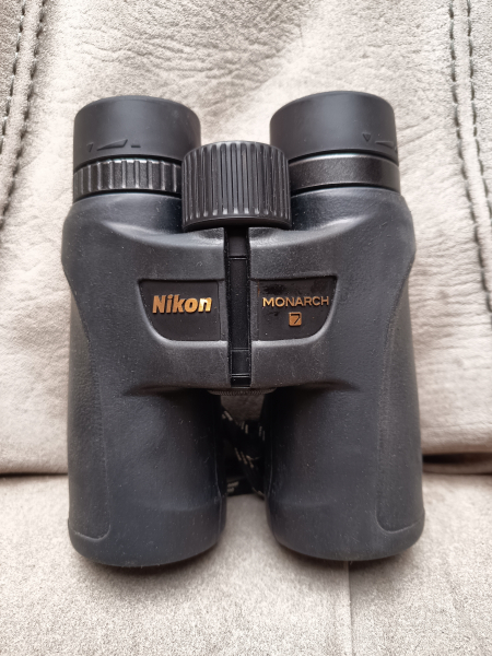 Fernglas Nikon Monarch 7 in 8x42 in gutem Zustand, leichte Gebrauchsspuren an der äusseren Armierung, Linsen alle klar und ohne Kratzer und keine Putzspuren, äußerst scharfes Bild durch ED-Linsen, dieelektrischer und phasenkorrigierter Vergütung, Aussenflächen der Linsen zusätzlich mit einer kratzfesten Vergütung versehen. Für ein 8x42 relativ leicht und kompakt. Grossses Sichtfeld 140 m auf 1000 m, sehr gute Brillentauglichkeit,