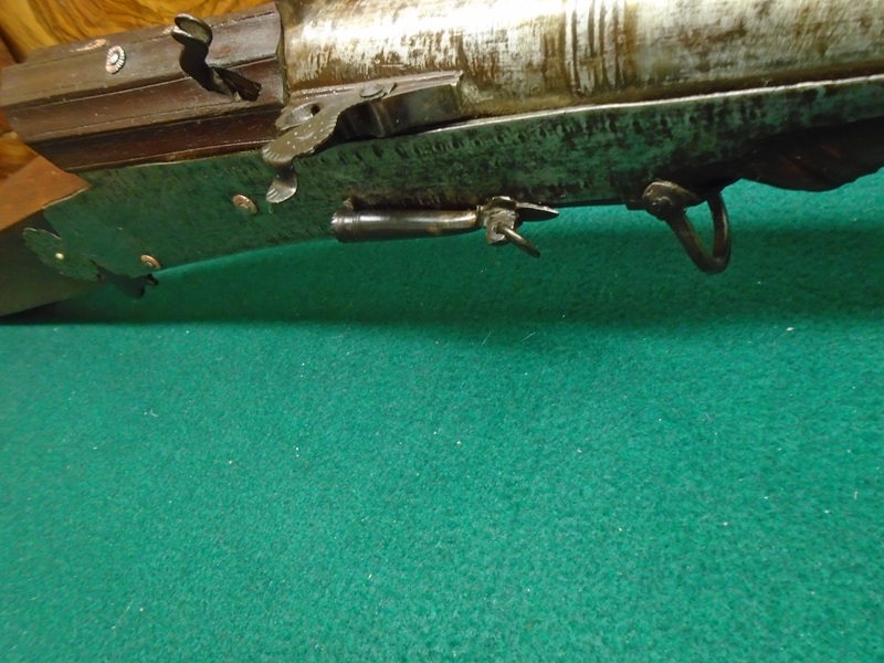 Besonders sind: die Ebenholzschaftkappe, sowie die markante Kanonenmündung, die dem Stück einen kraftvollen und historischen Charakter gibt. Der Ladestock fehlt, was bei älteren Stücken jedoch nicht ungewöhnlich ist. Abdeckbare Pulverpfanne. Gesamtlänge: 1,41 Meter und daher "Sperrgut" bei dem Versand. Lauflänge: 94 cm.