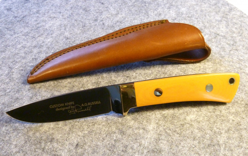 - Griffmaterial: beiges Elfenbeinmicarta, Messingnieten und Fangriemenöse