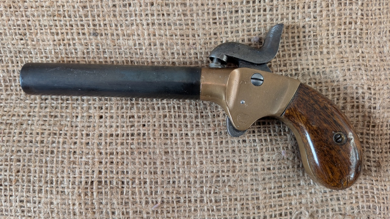 Biete einen Derringer von Palmetto im fraglichen Kaliber .36 (der Lauf ist nicht mit dem Kaliber beschriftet, ich messe einen Zugdurchmesser von 9,0 mm, einen Felddurchmesser von 8,6 mm). Der Lauf ist innen blank, die Seriennummer ist 7711, die Hahnfeder wirkt ordentlich stramm, die Brünierung am Lauf ist berieben, die hölzernen Griffschalen haben Kratzer im unteren Bereich. Ich habe nie mit dem Teil geschossen, es ist nur Deko bei mir gewesen, Zündhütchen 1075 lassen sich problemlos abschlagen. Siehe Bilder! Ich benötige zwingend einen Altersnachweis vor dem Versand! Der Versand erfolgt versichert und umgehend nach Zahlungseingang! Wer aus der Gegend ist, kann sich den Derringer natürlich auch abholen. Keine Garantie oder Rücknahme, Privatverkauf! Falls jemand Fragen zum Artikel haben sollte, werden diese umgehend beantwortet (also zumindest tagsüber...)!
