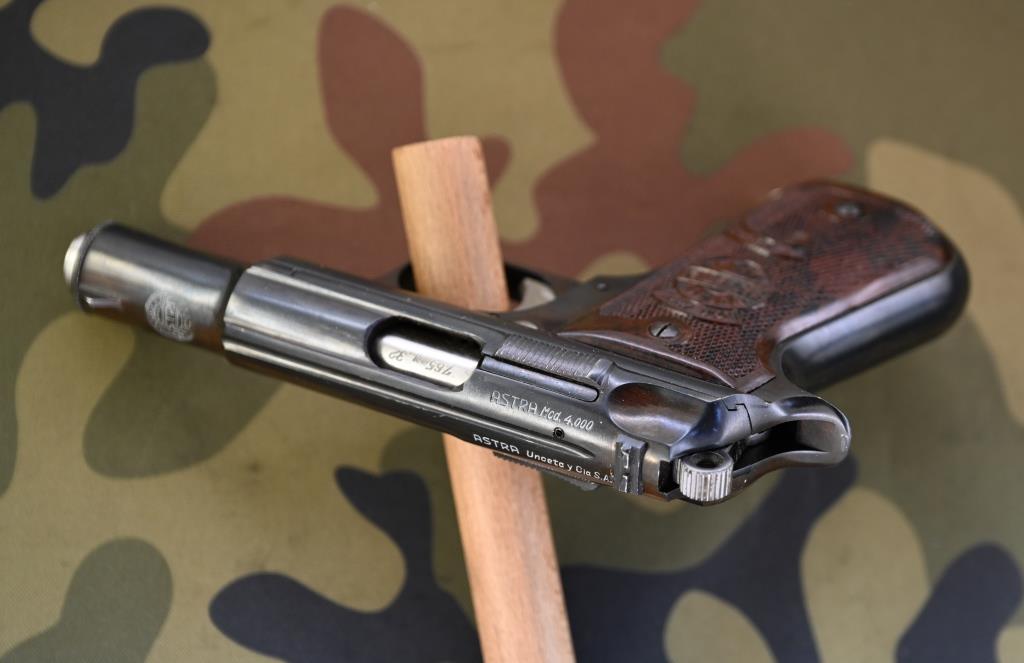 Kaliberangabe „7,65 mm .32“ auf dem Patronenlager, rundes Markenlogo „Astra“ oben auf Lauf, spanische Beschusszeichen (unter der linken Griffschale), codiert-datiert "K1" = 1965. Hersteller „ASTRA Unceta y Cia. S.A. Guernica - Spain", ASTRA Mod. 4.000“, Seriennummer "380330" rechts auf der Griffstückunterseite. Beide Griffschalen geprägt mit Modellbezeichnung und ASTRA-Rundlogo.