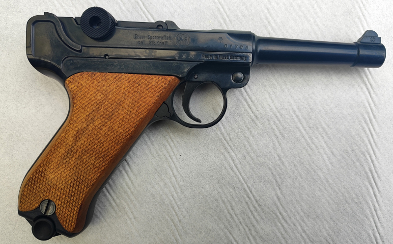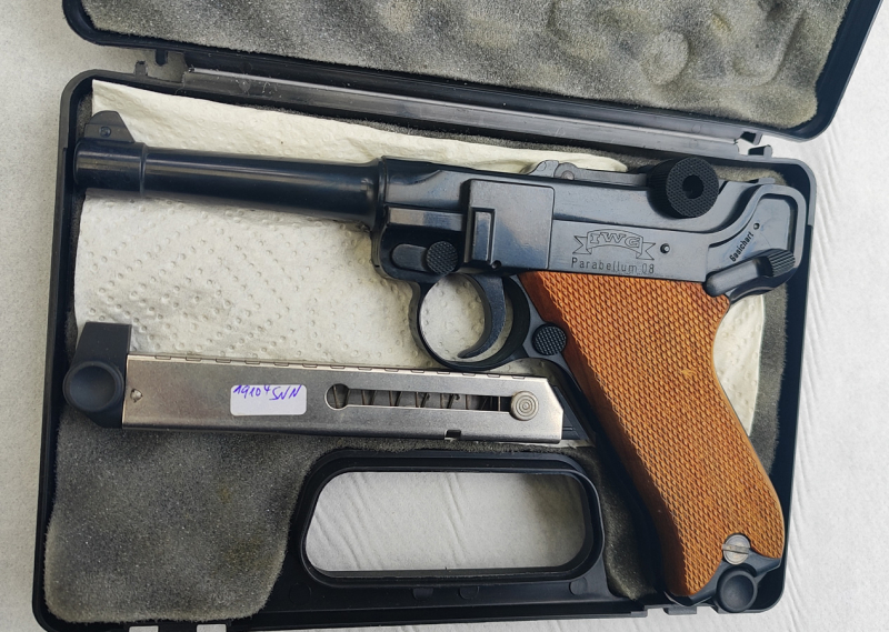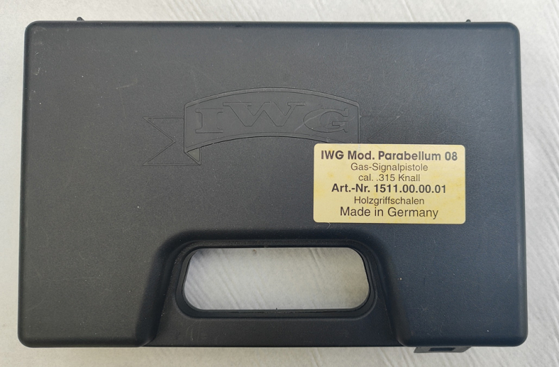 Biete IWG Parabellum 08 Gas-Signalpistole, mit Abschussbecher und Ersatzmagazin Original Holzgriffschalen.
