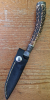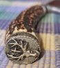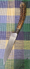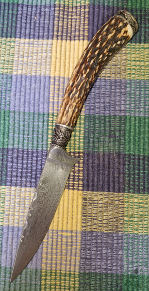 Sie bieten auf ein Jagd- und Brotzeitmesser, "Nicker", mit Damastklinge (10 cm, Torsion, 57-59 HRC, 288 Lagen), dekorativem, schlankem Horngriif, Passung mit Eichenlaub und Endkappe in ausgezeichnetem Zustand nach Eigenherstellung und Messertasche. Ein sehr zweckmäßiges und höchst dekoratives Messer, trachtengerecht!!!