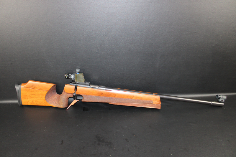 Ausgestattet mit UIT Schiene, Holz Auflagekeil, verstellbarer Wangenauflage und Schaftkappe sowie original Wather Diopter mit nachgerüsteten Farbfilter, Zoom und Dioptrienverstellung