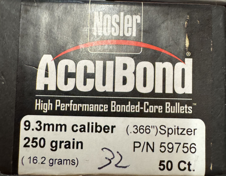 zum Verkauf stehen aus Wiederlader-Nachlass 32 x Geschosse Nosler Accubond .366/9,3mm - 250 grain schwer.
