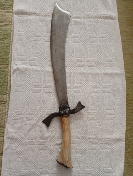 Biete eine mir unbekannten Malchus an, vermutlich DEKO? Die Klinge ist geschliffen, der Griff aus Beinmaterial gefertigt, die S-förmige Parierstange ist genietet.