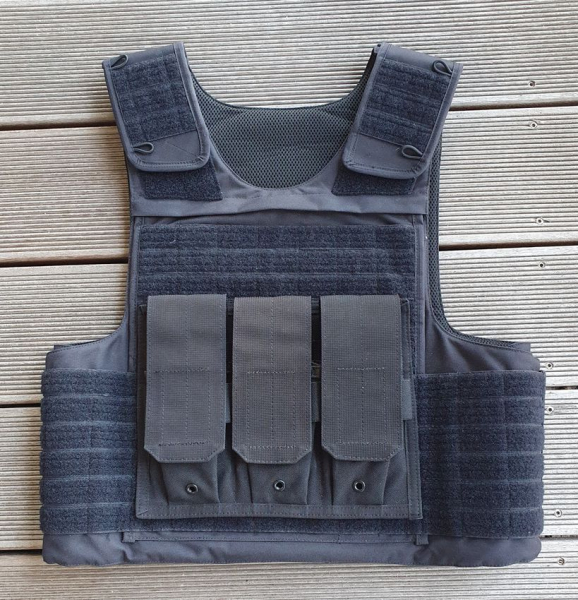 BSST Plate Carrier Plate Carrier aus schwarzem Cordura, wahlweise verwendbar für Stand-alone-Platten oder in Kombination mit Aufnahme von Unterziehpanels, Kabelführung beidseitig für Kommunikations- und Hydrationssystem, MOLLE-Ausnahmen vorn und hinten plus 3er-Magazintasche auf Velcro-Basis. Privatverkauf.