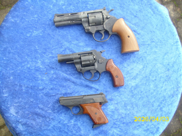 Verkaufe hier aus einem Nachlass ein Konvolut Signalrevolver und Pistole bestehend aus : ME Magnum Revolver im cal. 9 mm PTB 438 + Röhm RG 79 cal. 9 mm PTB 53 + Röhm RG 8 cal. 8 mm PTB 154 in gebrauchtem, ungereinigtem Fundzustand, das heißt, dass Gebrauchsspuren vorhanden sind, der RG 79 Revolver lässt sich nicht immer spannen und abschlagen, in der Double Action funktioniert er bis an die letzte Kammer, da bremst die Trommel, daher wird er als defekt verkauft, die RG 8 und der Me Magnum funktionieren, wie abgebildet. Den weiteren Zustand entnehmen Sie bitte den Bildern, die auch Bestandteil der Artikelbeschreibung sind.