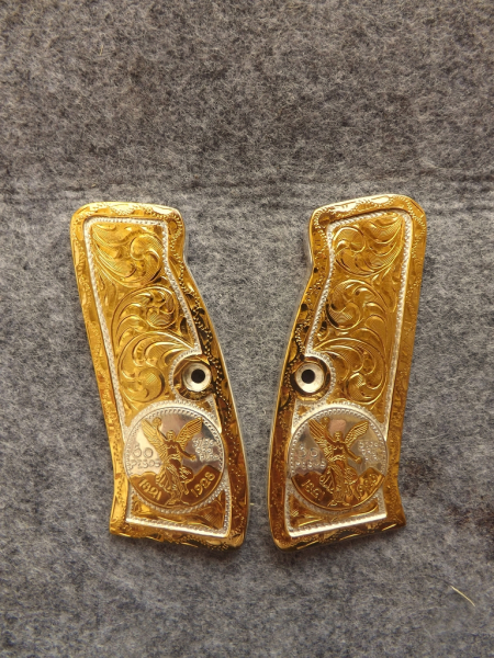 Ein Satz absoluter Einzelstücke, diese Griffschalen wurden für meine CZ 75 passgenau in Mexiko angefertigt, die gibt es nur ein einziges mal auf der Welt, echte Einzelstücke, beide wurden handwerklich angefertigt, keine Massenware, echte Handwerkskunst, absolut unbeschöädigt, absolut passgenau, echte Hartvergoldung, echte Versilberung, keinerlei Beschädigungen oder Kratzer, liegen sehr gut in der Hand, sitzen sehr gut an der Waffe, muss mich leider davon trennen. Ein echter Hingucker eben, sie werden begeistert sein, diese Griffe hat ausser ihnen niemand sonst auf der Welt