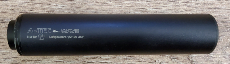 Verkauft wird ein selten genutzter A-TEC Wave Schalldämpfer für Luftdruckwaffen mit dem Gewinde 1/2x20 UNF.