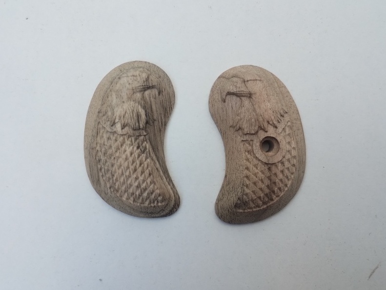 Die Griffschalen haben Adlerkopf-Gravur und sind unversiegelt auf der Oberfläche, damit der Verbraucher die Griffschalen nach seinem eigenen Wunsch färben (beizen), ölen oder wachsen kann.