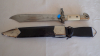 Klinge mit Hersteller "Original Eickhorn Solingen", Verschraubte Griffschallen, auf der Fehlschärfe "7060" geätzt, die Scheide mit Originallack, auf dem Mundblech nummerngleich "7060" gestempelt, originales, getragenes Stück , komplett mit dem schwarzen Lederhänger.
