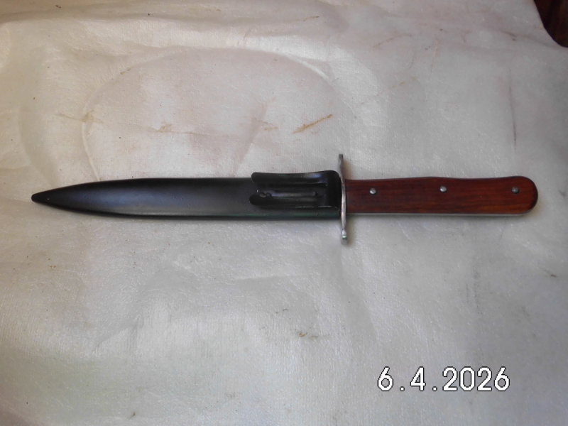 Verkaufe repro Feldmesser 42 der Wehrmacht. Klinge gestempelt mit hat 1942. Scheide leichtgängig aus Stahl. War wohl für Graben/Sturmangriff/ Stoßtrupp gedacht. Griffschalen aus Holz, Passgenau. Komplettlänge 29,5cm. Klinge 17,5cm. Klingenbreite 2,0cm. D. 3,5mm