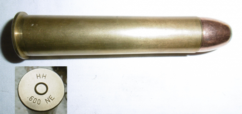 eine Deko-Patrone .600 Nitro Express in Horneber-Hülse. Patrone ist ohne Ladung, zum Nachweis ist eine Klapper-Kugel eingelegt.