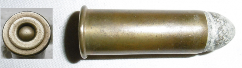 eine Deko-Patrone .585 Berdan Musket, ohne Bodenstempel, eine UMC-Fertigung 1869 in USDA eingeführt. Weitere informationen in "Cartridges of the World", Band 13, Seite 161. Patrone ist ohne Ladung, zum Nachweis ist eine Klapper-Kugel eingelegt.