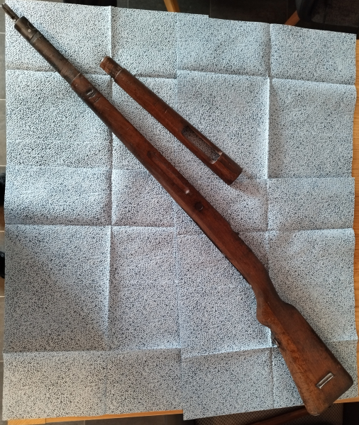 Wie abgebildet wird ein La Coruna Schaft von 1952 verkauft. Da es sich um einen Schaft einer alten Dekowaffe handelt, befindet sich ein ca. 7mm breites und 5mm tiefes Bohrloch im Bereich der Laufbettung. Beeinträchtigungen bestehen meiner Meinung dadurch nicht.