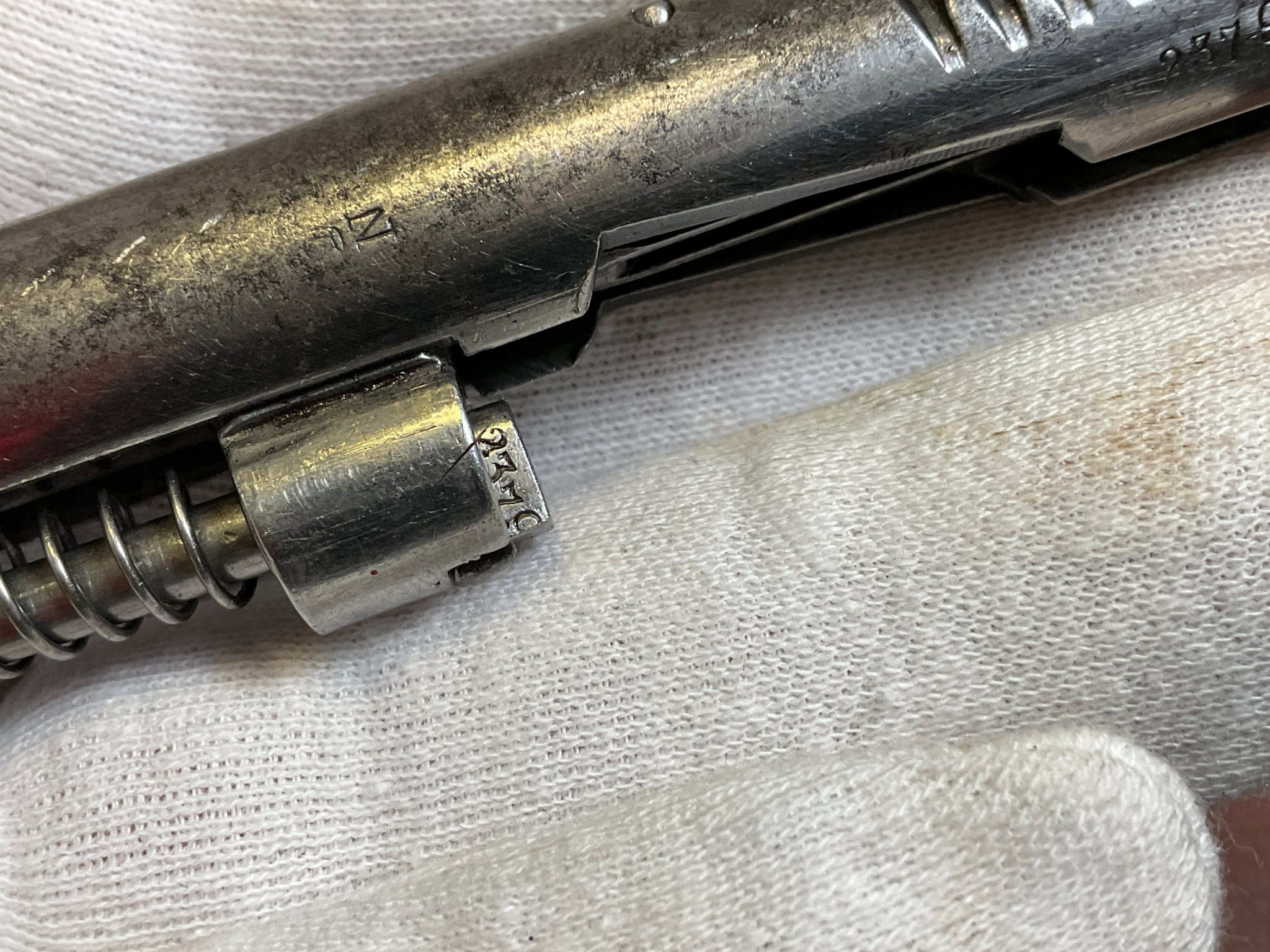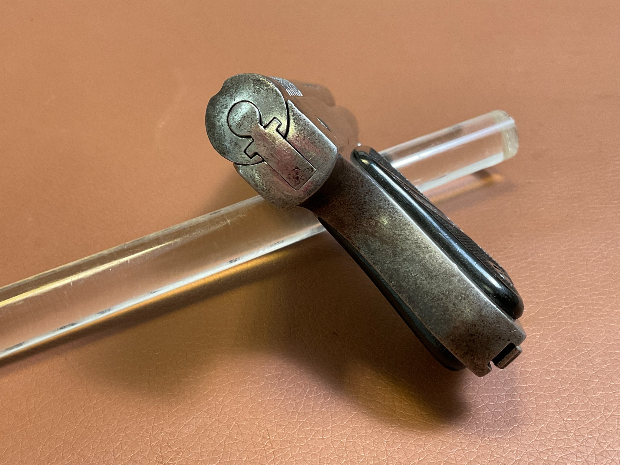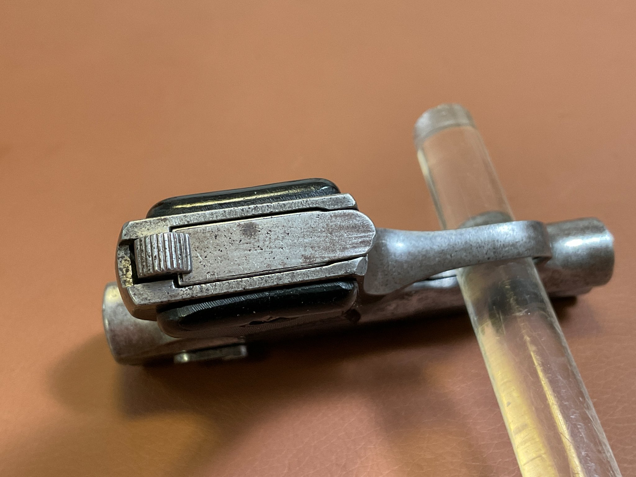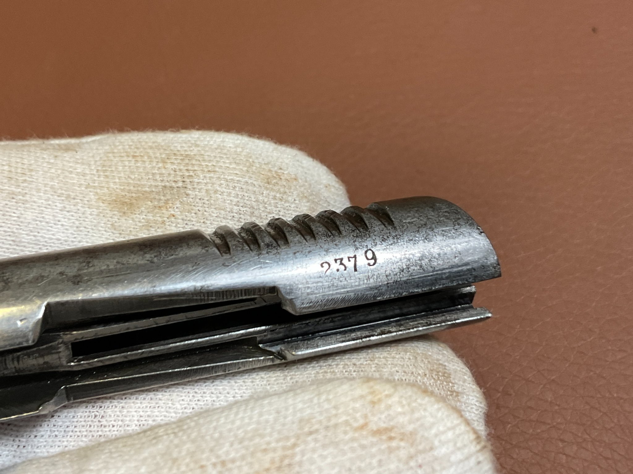 Die Waffe weist deutliche Abnutzungen an der originalen Brünierung auf.
