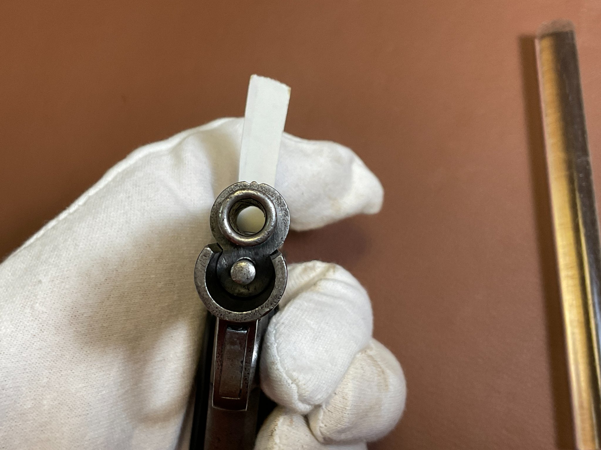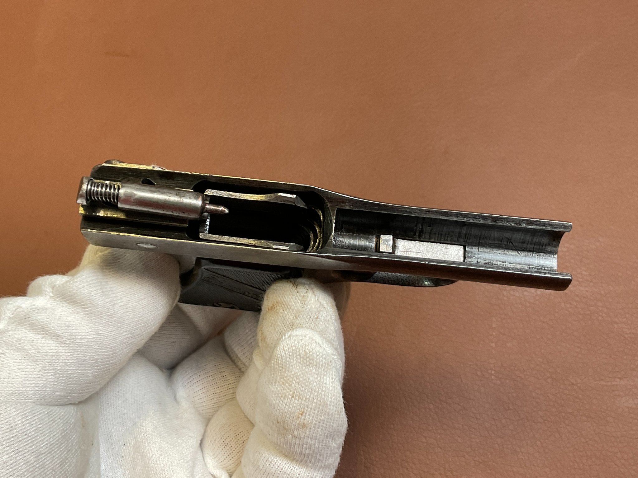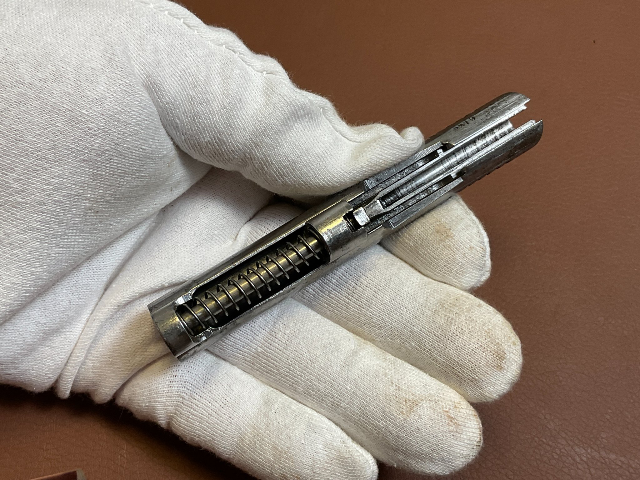 Die Waffe weist deutliche Abnutzungen an der originalen Brünierung auf.