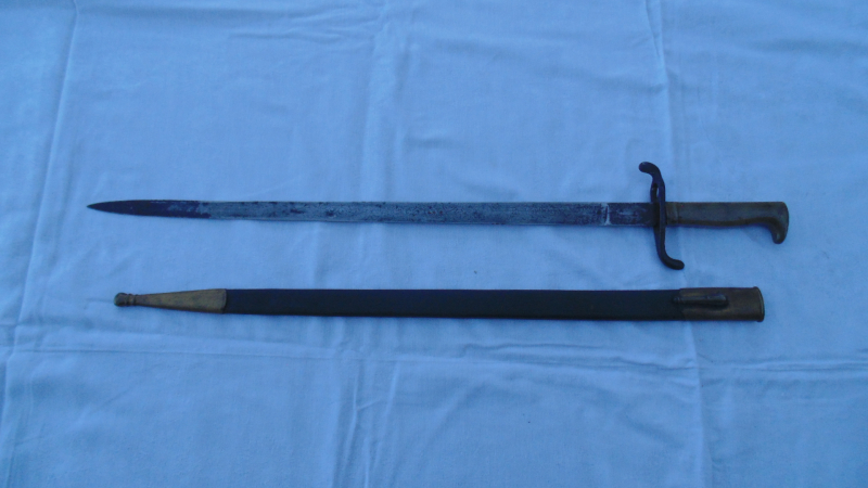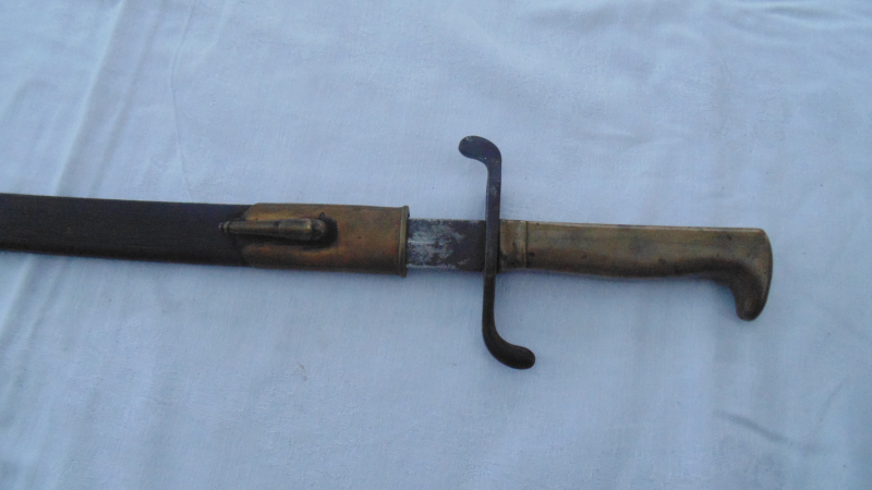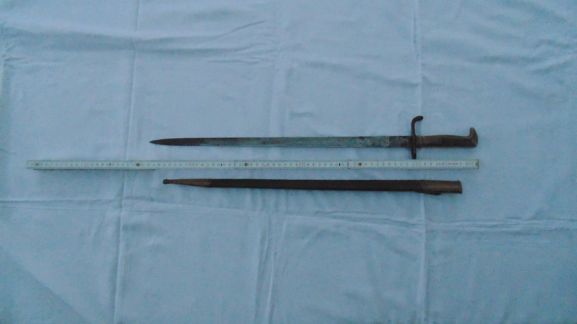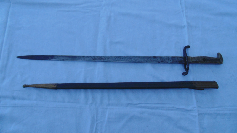 Zum verkauf steht ein Bajonett M71 ohne Herstellerangabe .Länge inklusive Scheide ist ca. 63,5 cm. Die Klinge ist Verziert und 48,8 cm lang und lässt sich leider nicht komplett in die Scheide stecken es fehlt ungefähr 1cm ( Die Spitze an der Scheide scheint verstoppft zu sein ). Der Drücker ist festgeklebt . Da ich keine Ahnung von Bajonetten, Säbeln und Degen habe will ich keine falschen Angaben machen.