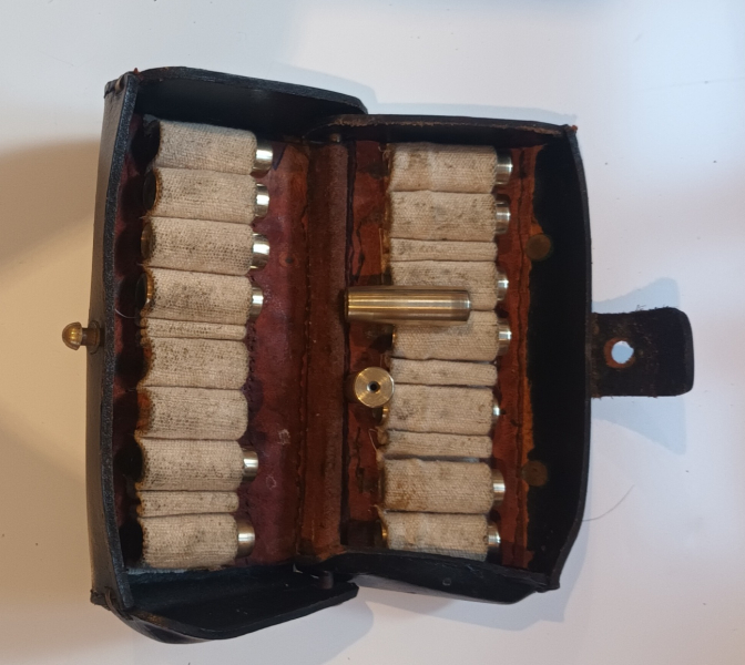 Zum Verkauf kommen 15 Messinghülsen Kaliber .45 für eine Sharps I.A.B Gardone in einem stabilen Lederholster mit der Prägung "US". Die zwei Reihen zur Hülsenaufnahme sind etwas herausklappbar, die Schlaufen aus stabilen Leinen. Das Holster besitzt zwei Gürtelschlaufen. Beide Hälften des Holsters sind mit einer stabilen Messingstange verbunden. Insgesamt ein sehr schönes Stück!