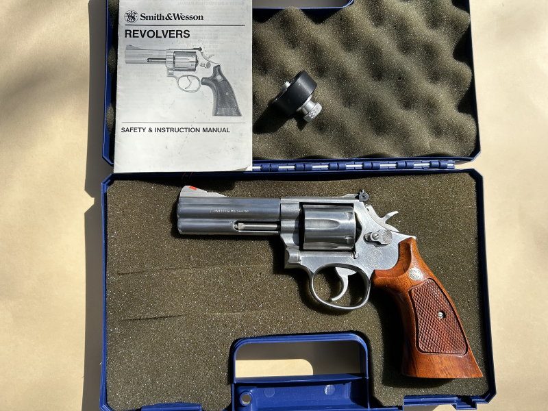 Revolver aus einem Nachlass Hersteller: Smith & Wesson L-Rahmen Modell: 686-2 .357 Magnum/38 Special Lauflänge: 4 Zoll/10,4 cm, Trommel 6 Schuss. Verstellbare Visierung. Stainless Oberfläche im neuwertigen Zustand, wenig benutzt. Lauf blank. SA/DA-Abzug. Griffschalen Original-Nussbaum. Zubehör Original Koffer, Speed Loader und eine Bedienungsanleitung.