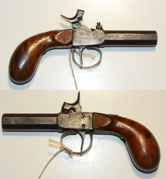 Perkussionsterzerol, Lauflänge 5,9 cm, Gesamtlänge 16,9 cm, Kaliber 11,5 mm, Griffstück rechts vorn unten kleiner Ausbruch, Metall braun angelaufen, technisch in Ordnung