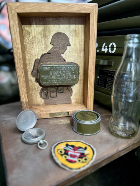 Angeboten wird ein besonderes Sammlerstück aus dem Bereich US Army / Zweiter Weltkrieg: Im Mittelpunkt steht ein originales First Aid Packet (Carlisle Model), das in ein hochwertiges, handgefertigtes Holz-Display integriert wurde. Ziel der Gestaltung ist eine stimmige Kombination aus originalem Militärgegenstand und dekorativer Präsentation. Der Rahmen besteht aus Massivholz. Der Hintergrund ist thematisch passend gestaltet, mit Soldaten-Silhouette und angedeuteten Kartenelementen, wodurch ein geschlossenes Gesamtbild entsteht.