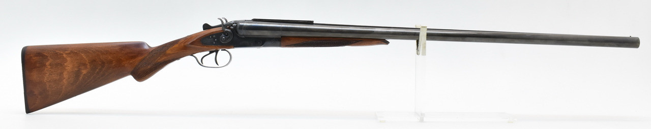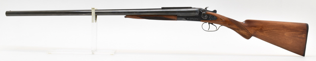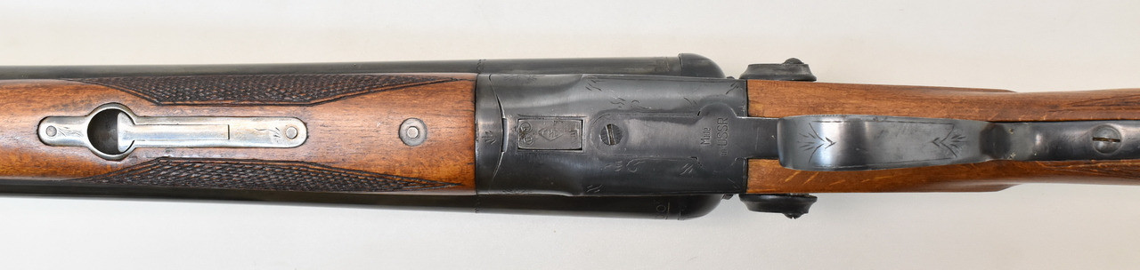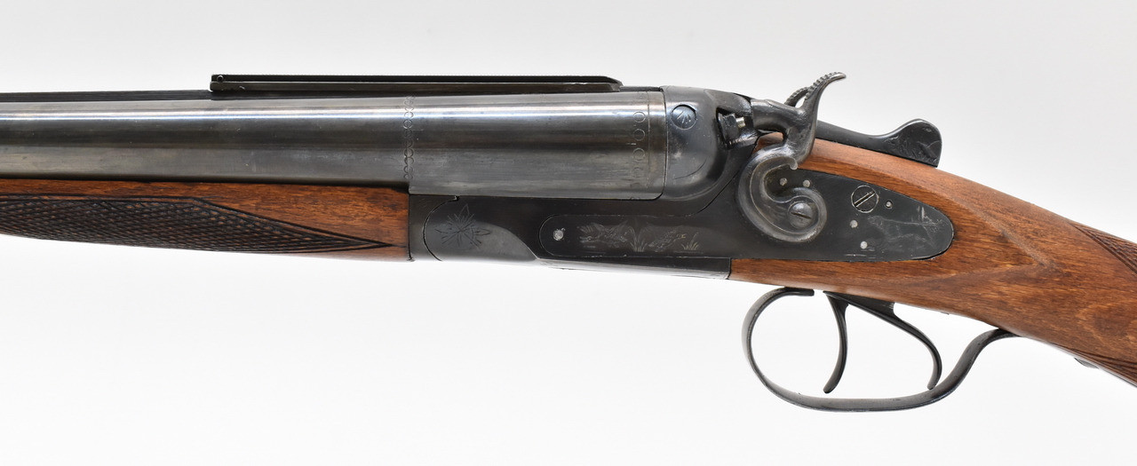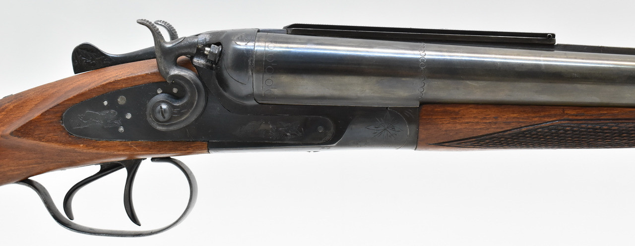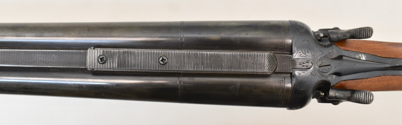 Hahn-Doppelflinte mit schwarzer Basküle und kleiner Gravur. 1/2 - 3/4 Choke, dichter Verschluß und blanke Läufe. 37cm langer Schaft, gemessen vom vorderen Abzug bis Mitte Schaftkappe. Beschuss von 09/1971.