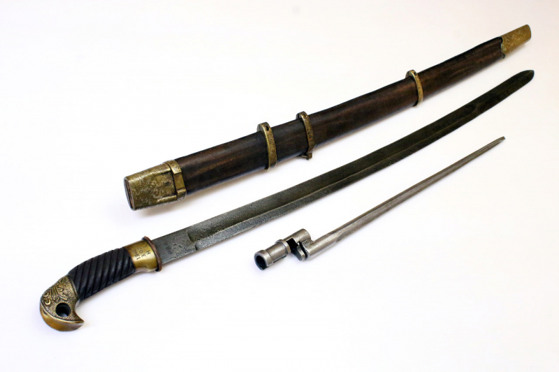 Zur Schaschka ein Bajonett Mosin Nagant 91/30 in der Tragevorrichtung an der Scheide. Das blanke Bajonett en suite im Antik-Finish.
