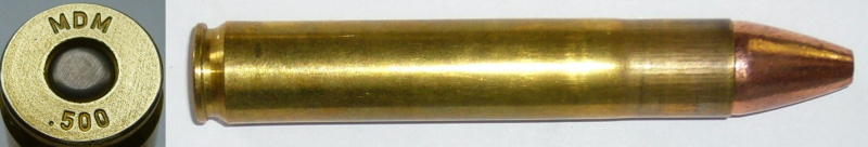 eine Deko-Patrone .500 Michael D. McCourry ( M D M .500 ) ein Eigenkaliber. Patrone ist ohne Ladung, zum Nachweis ist eine Klapper-Kugel eingelegt.