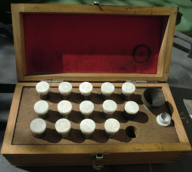 es sind 14 Glasröhrchen für Schwarzpulver dabei; eins fehlt, eins gerissen