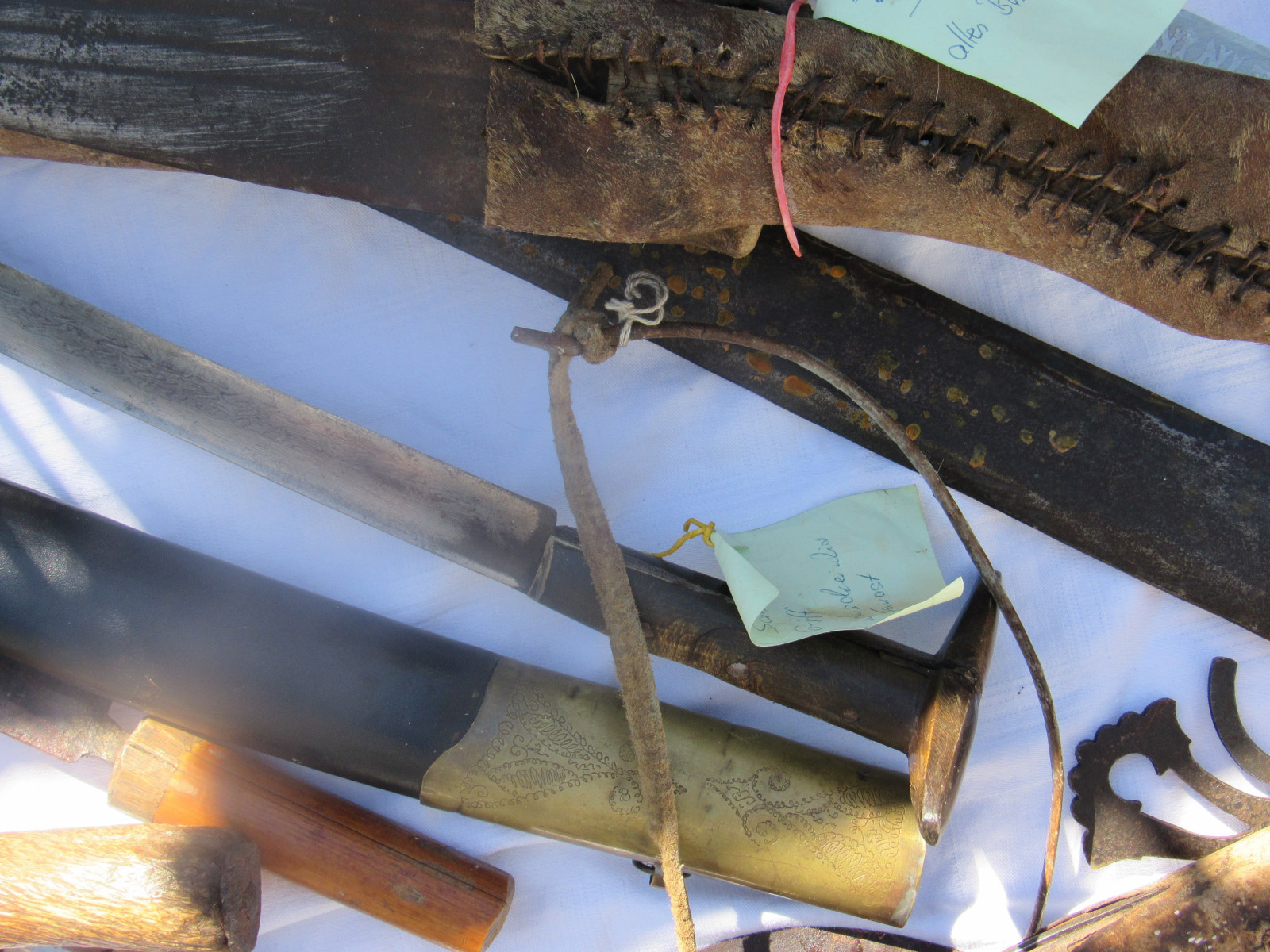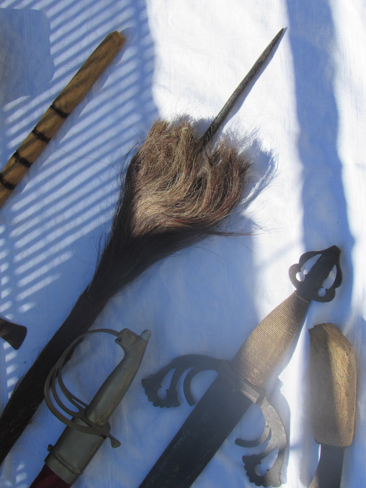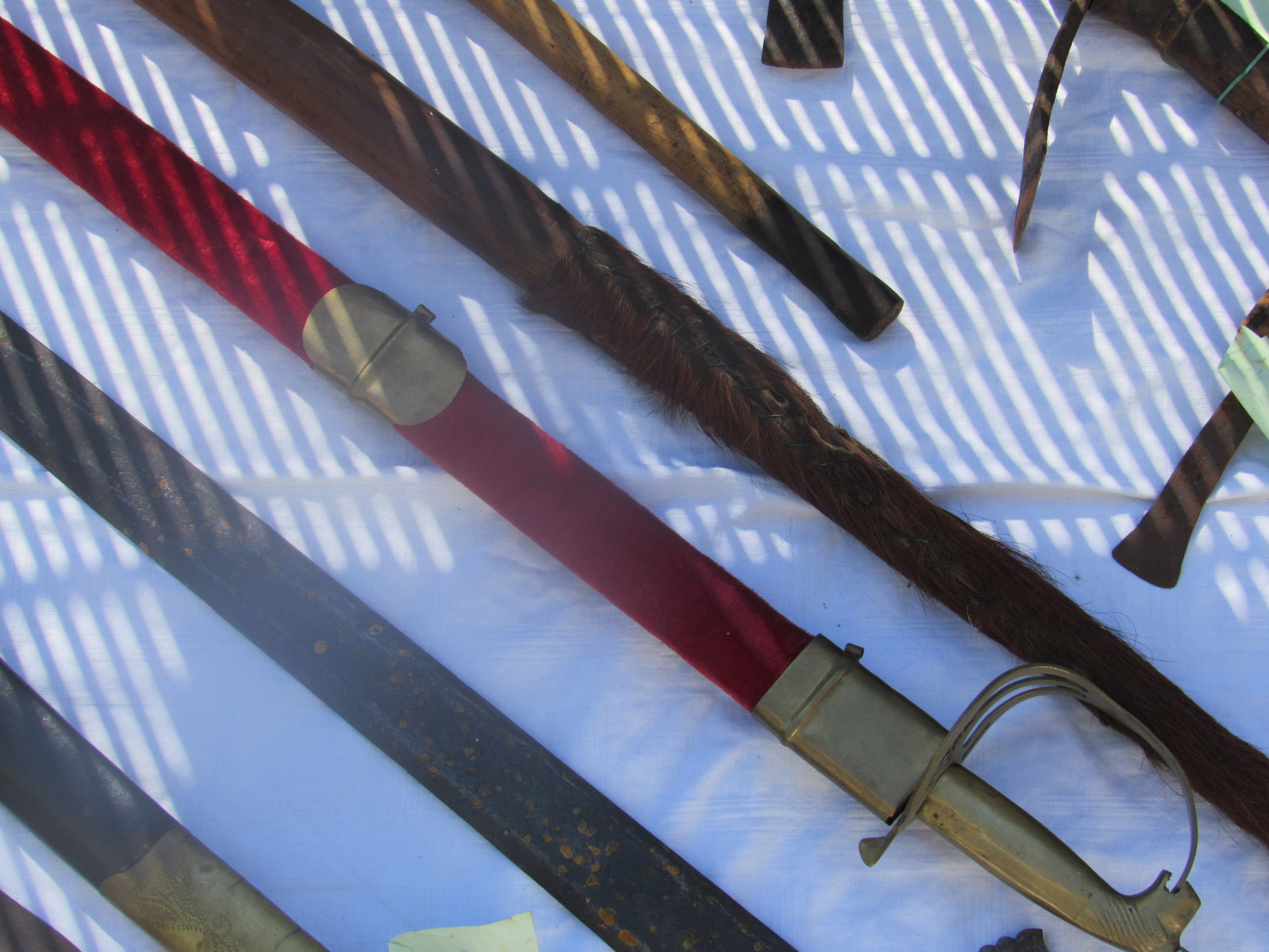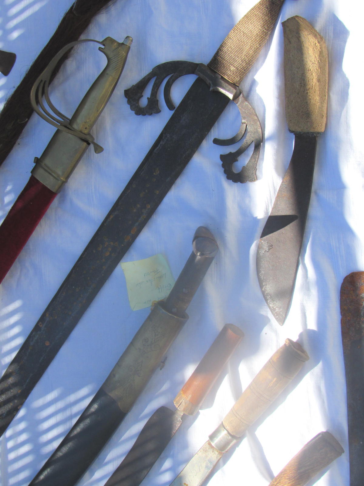 Zustand: Langer Schwert am Knauf beschädigt. Teils mit Belag und Rost. Klingen teils Beschliffen sowie weitere Alters und Gebrauchsspuren.