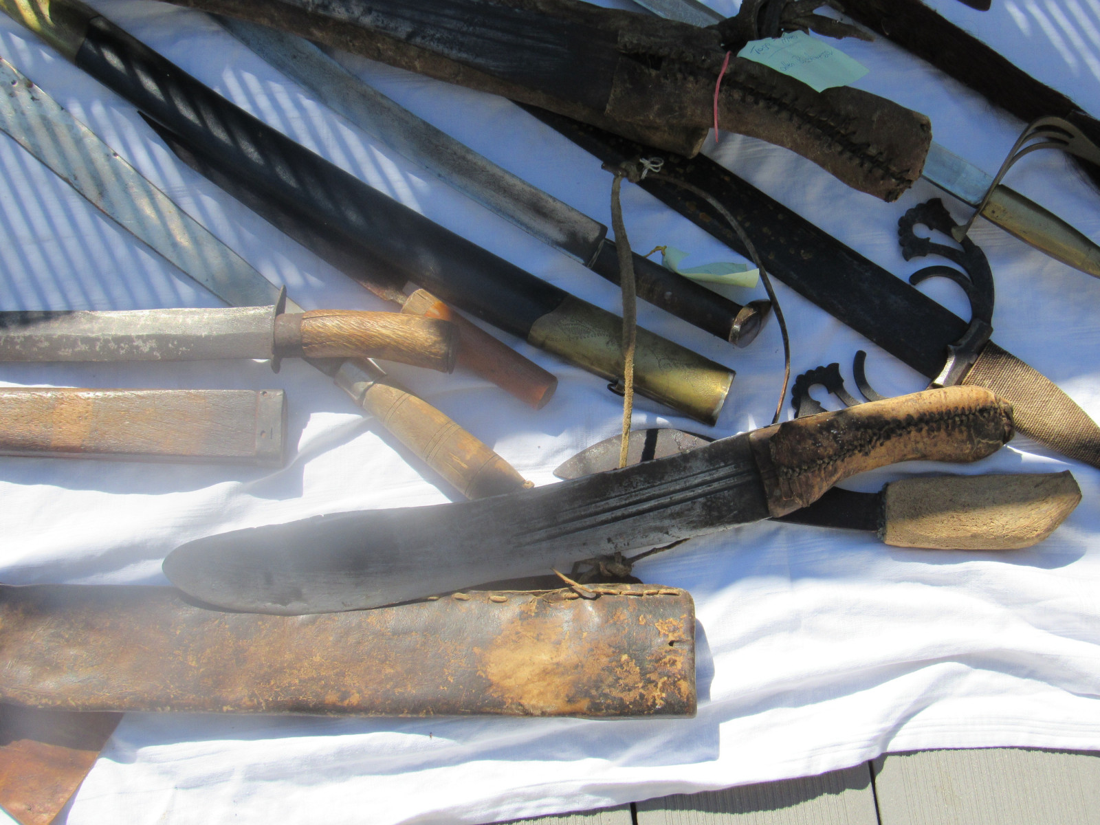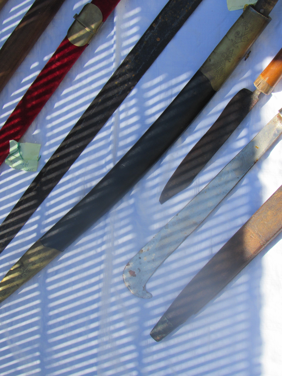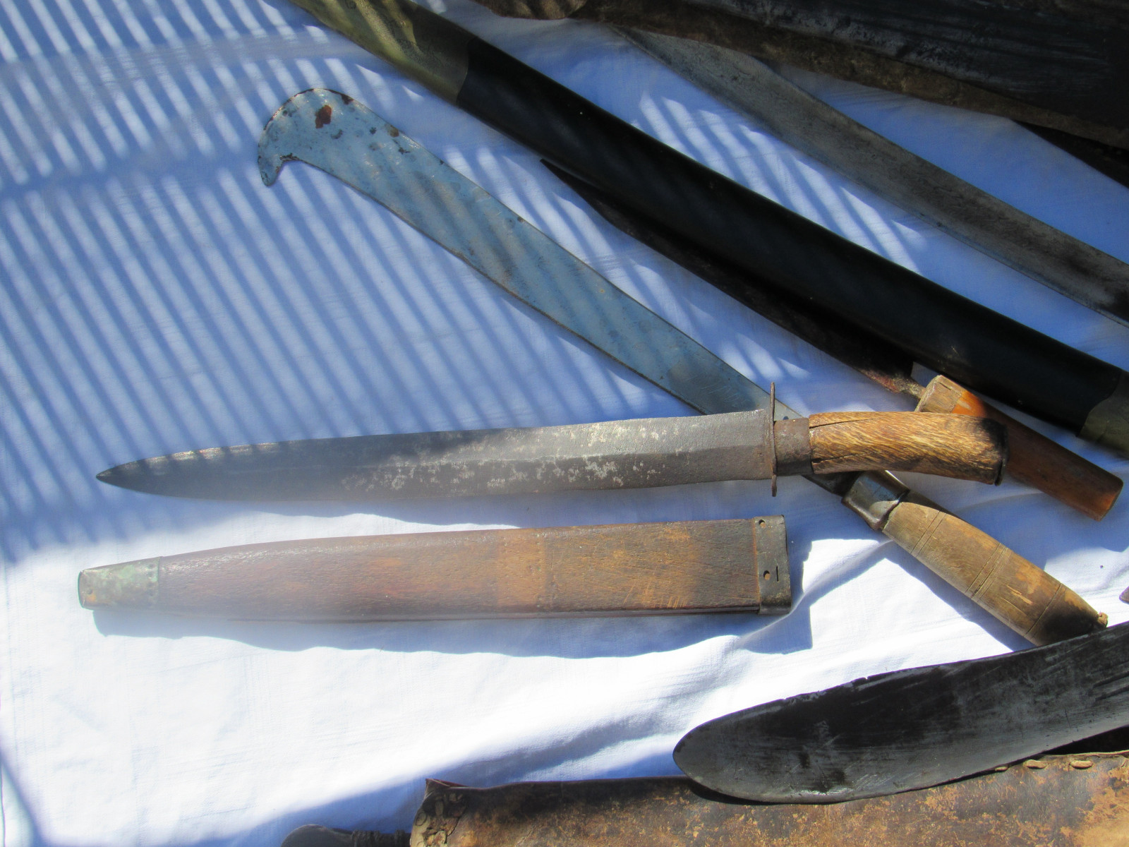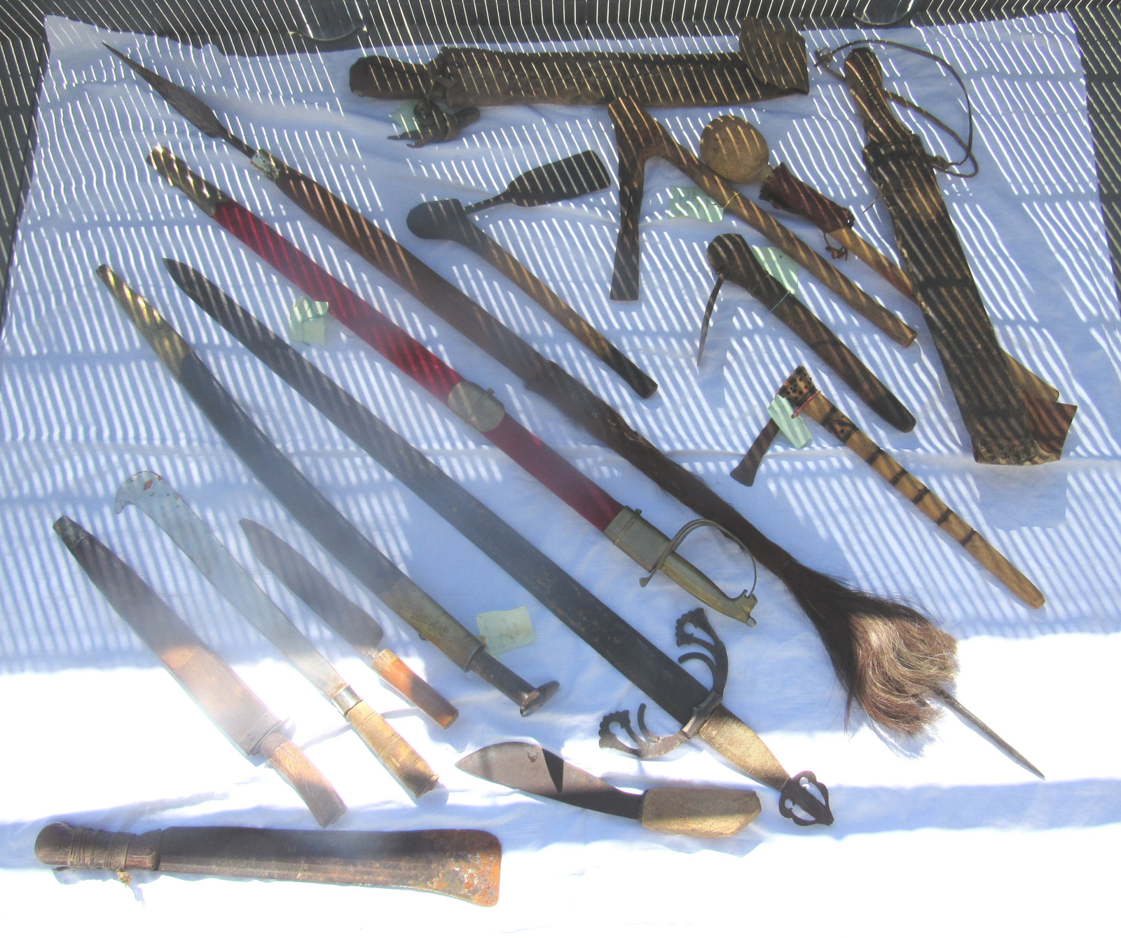 Zustand: Langer Schwert am Knauf beschädigt. Teils mit Belag und Rost. Klingen teils Beschliffen sowie weitere Alters und Gebrauchsspuren.