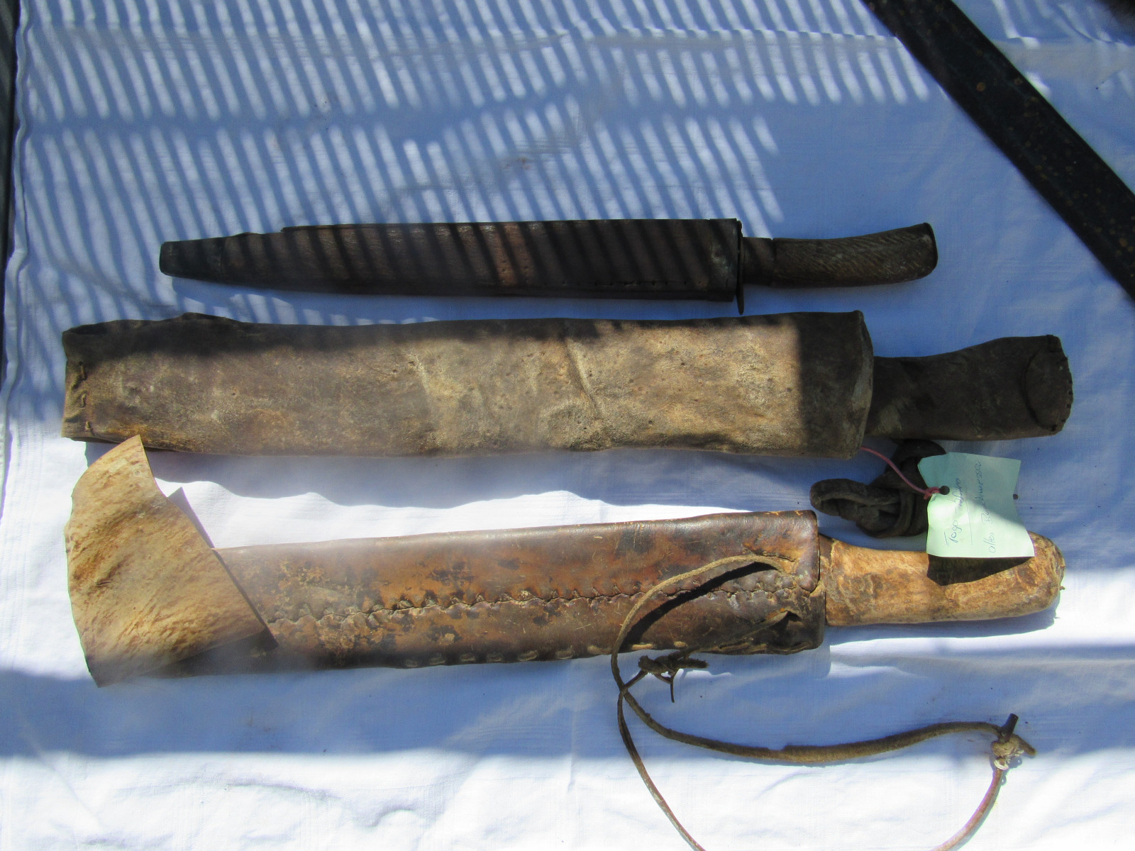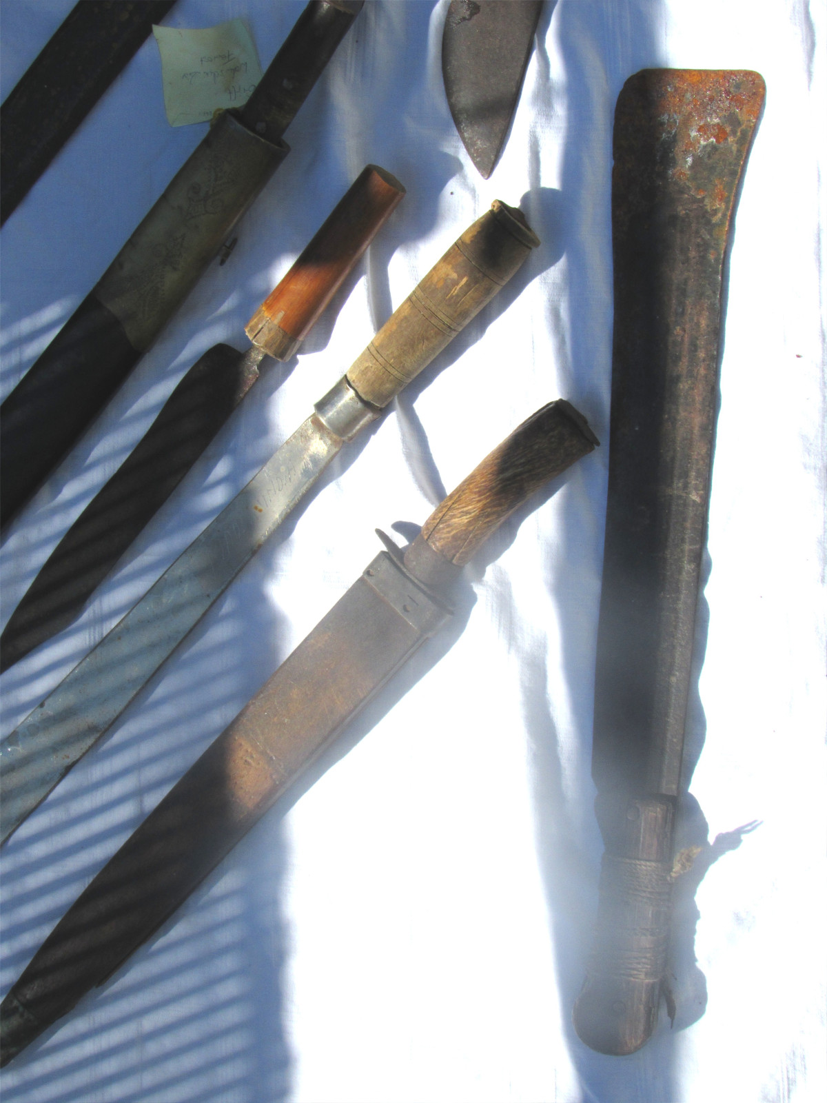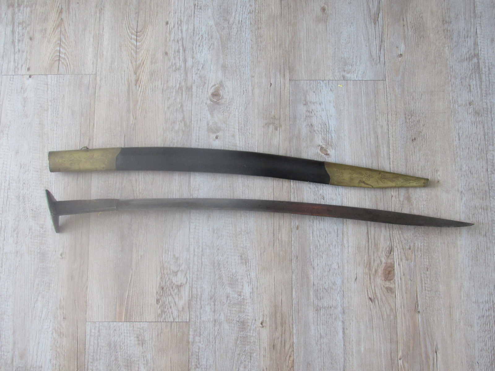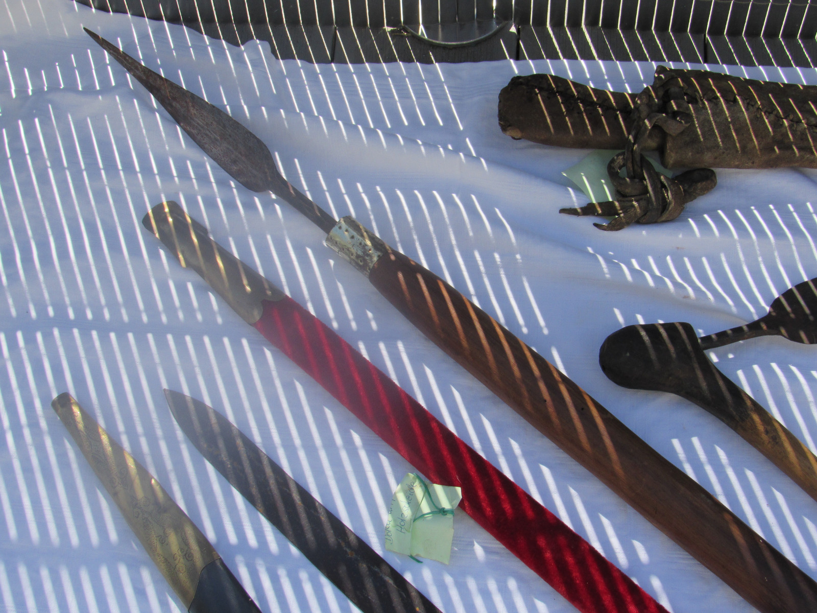 Zustand: Langer Schwert am Knauf beschädigt. Teils mit Belag und Rost. Klingen teils Beschliffen sowie weitere Alters und Gebrauchsspuren.