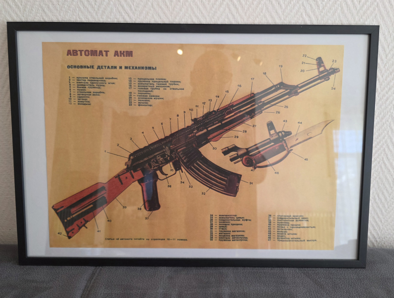 Ich verkaufe ein dekoratives Poster des AK M (Kalaschnikow) mit russischer Beschriftung.
