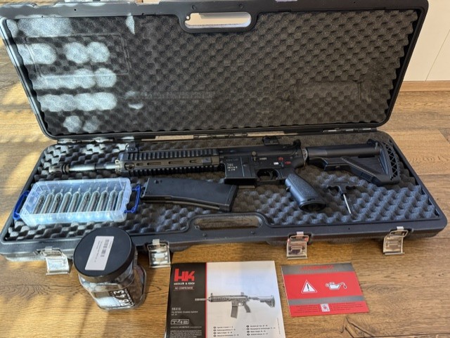 HK416D T4E inkl. 1x Magazin (649,00 EUR), 10x Co2 Kapsel in separaten Plastikbox (20,00 EUR), ca. 450 Rubberballs Cal. 43 (500 Stück Pack angebrochen) (20,00 EUR) + Hochwertiger Koffer und Anleitungen. Gesamtpreis ca. 690,00 EUR.