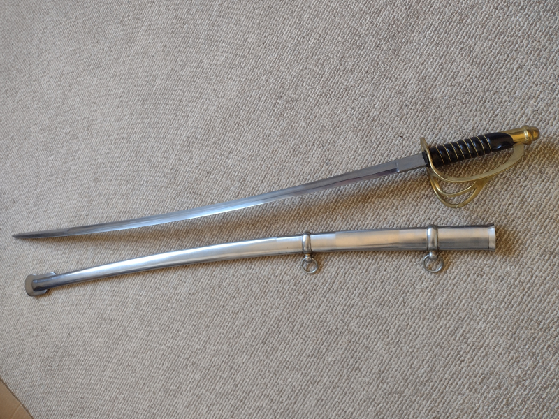 Aus einer Sammlungsauflösung wird das folgende Stück angeboten, eine Replika des US Kavalleriesäbels M1860. Sehr schön verarbeitet,keine Kratzer, bisschen Flugrost an der Scheide, aber oberflächlich. Alles fest, nichts wackelt, indische Anfertigung, habe es seit gut 20 Jahren.