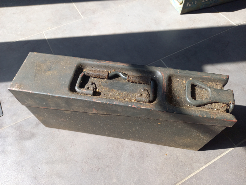 Patronenkasten gefüllt mit zwei Behältnissen für Petroleum und Waffenschmierfett. Guter Zustand ungereinigt, sogut wie kein Rost. Petroleumbehälter ohne Stempel. Alles Andere müsste vor 1945 sein.